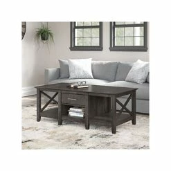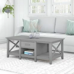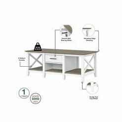 Featuring a relaxed modern farmhouse style, the Bush Furniture Key West console table with drawers and shelves is a perfect choice for your casual home. This table is a perfect way to bring the feel of a coastal retreat to any living space. Unique X pattern accents and a slightly weathered finish present a look that works well in homes that embrace farmhouse styling. Box drawers organize household supplies while two shelves offer plenty of room for books, decorations, and more. The bottom shelf is fixed for stability, and the upper shelf can be adjusted to accommodate items of various sizes. The surface is perfect for displaying personal touches like plants, pictures, and other decors. Use the 30″H x 47″W x 16″D sofa table on its own or combine it with coordinating Key West products for a complete living room furniture set. This console table with storage has been rigorously tested to meet Bush Furniture standards for safety, performance, and durability and is backed by a 1-year warranty.
