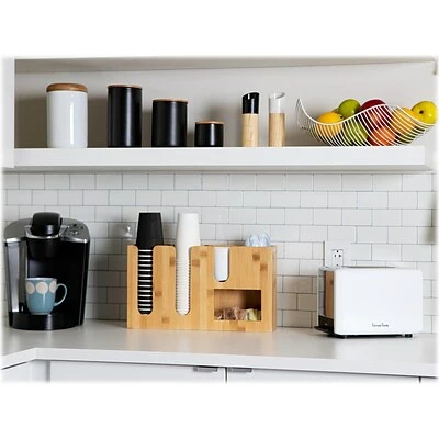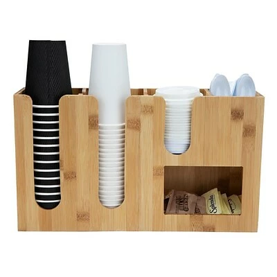Load up the compartments of this organizer with paper or plastic cups and lids, utensils, drinking straws, or coffee stirrers, with room in the lower cave for sweetener packets or tea