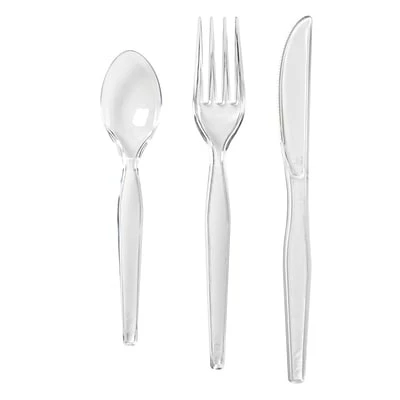 Host a catered in-house meal or company potluck with ease when you’ve got this 180-piece Dixie plastic clear cutlery keeper with assorted forks, knives and spoons in stock. Filled with enough cutlery to equip 60 diners, the convenient tray is reclosable for efficient storage and sanitation and easy to stack if you buy multiple sets. Each strong and rigid, full-size knife, fork and teaspoon in this cutlery set is made of crystal clear, heavyweight plastic that does not shatter or bend and stands up to the thickest cuts of meat.