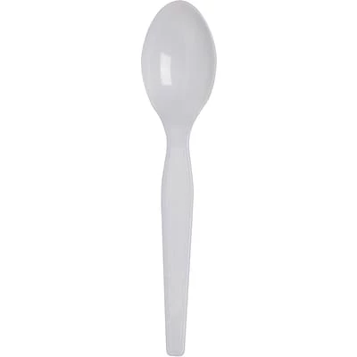 Keep your teachers lounge or employee lunchroom well-stocked with this box of 100 plastic spoons. Take the compact cardboard box full of spoons along when you head to an off-site meeting to ensure that you and your employees have a suitable utensil for stirring tea or coffee, eating soup, or enjoying ice cream.