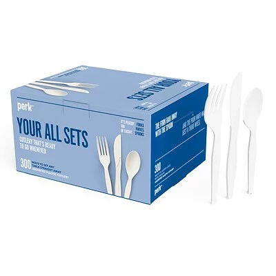 Cover every angle of cutting, spreading and eating your lunch with this assorted cutlery set. Everything’s even-stevens with 100 each of forks, knives and spoons, so you and your co-workers can lift whatever is on your plates. On your mark, get set and go ahead and set the table with this Perk™ assorted medium-weight plastic cutlery set.