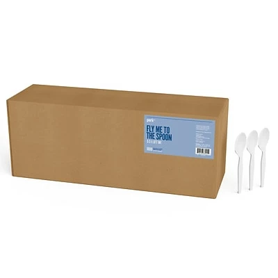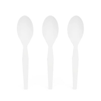 Shuttle it from here to there with these disposable plastic spoons. The sturdy medium-weight construction is up to the task of delivering soups or stews to their destination. Then these Perk™ white plastic spoons can be thrown in a waste bin at the end of lunch.