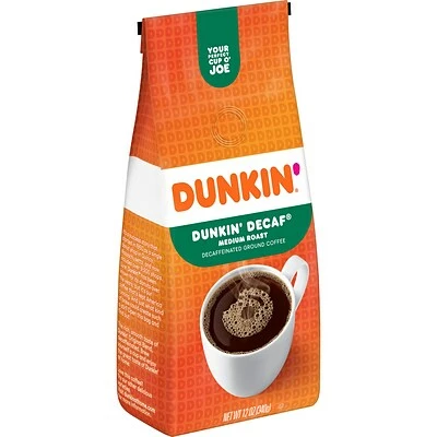 Offer customers, clients and staff a hot, soothing beverage with this decaf coffee. The medium roast delivers full-bodied flavor, and the 100-percent Arabica beans ensure quality with every pot you brew. The beans are already ground for fast, easy preparation. This Dunkin’ coffee is decaffeinated, so you can pour a mug any time you need to take a break from the workday.