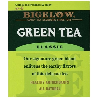 Bigelow Classic Green Tea provides essential antioxidants making it both delicious and healthy! Our tea is not harsh not too grassy but smooth and very delicate… easy to drink hot or iced. Enjoy the whole cup and then treat yourself to another. Our tea bags are sealed for freshness in airtight flavor protecting fresh packs to ensure your full enjoyment. Leave it to Mother Nature and Bigelow! Mother Nature gave us a wonderful gift when she packed powerful antioxidants into green tea. These powerful antioxidants in green tea act as natural combatants that contribute to healthy cell integrity by absorbing harmful free radicals. More and more studies are showing that drinking 2-3 cups a day may contribute to your body’s well being. But not all green tea tastes the same. Bigelow uses only the finest quality tea grown in higher-elevation gardens and hand picked at its peak. Then we carefully process the tea to bring out it’s natural smooth flavor. The tea bags are then sealed in flavor-protecting pouches to ensure our green tea’s goodness. What more can you ask for a product that contains antioxidants and tastes great! So go ahead enjoy a cup or two or three throughout your busy day. Bigelow Green Tea drink it once and you’ll discover a whole new dimension in green tea enjoyment. Another quality product from the Bigelow family blenders of fine tea for three generations. Blended and packaged in the U.S.A.