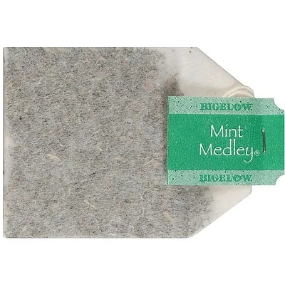 Bigelowยฎ Mint Medley is a refreshing blend of cool garden spearmint and peppermint that is delicious hot or iced sweetened or unsweetened. It’s the perfect perfectly refreshing cup of tea. Individual fresh pack. A refreshing herb tea blend of peppermint and spearmint. No caffeine. All natural. Special fresh-pack locks in flavor. For three generations the Bigelow family has specialized in creating a variety of deliciously different teas and herb teas. Our individually overwrapped tea bags ensure that the last cup of tea you have from this box is just as delicious as the first. Each tea bag is individually sealed in a foil packet. Blended and packaged in the U.S.A.