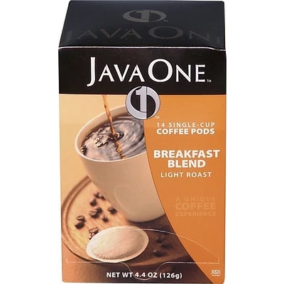 Java One® Single cup breakfast blend flavor ground Coffee is filled in 0.3 oz pod and is regular caffeinated to prevent health risk. Coffee delivers high-quality smooth, rich taste and brews 8 – 10 oz cup, sold as 14 pods per box.