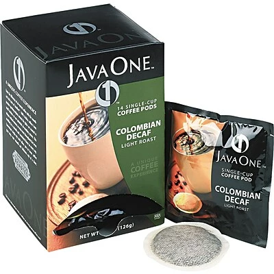 Java One® Single cup Colombian ground Coffee is filled in 0.3 oz pod and is de-caffeinated to prevent health risks. Light roast Coffee delivers high-quality smooth and rich taste and used to brew a 8 – 10 oz cup of beverage, sold as 14 pods per box.