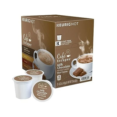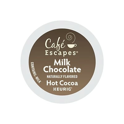 Provide your staff an alternative to coffee with this Keurig K-Cup Cafe Escapes milk chocolate hot cocoa 24-pack. Individual pods eliminate mess in the break room or coffee area, letting employees and visitors make one rich, creamy cup at a time. Containing just 10 milligrams of caffeine per cup, this Keurig K-Cup Cafe Escapes milk chocolate hot cocoa delivers a smooth mid-morning change from highly caffeinated beverages.