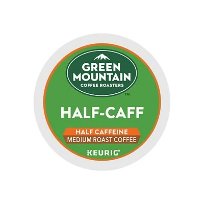 Get your day started with Green Mountain Coffee Half-Caff Coffee K-Cup pods. Enjoy the subtle hints of chocolate and raisin in this medium-roast coffee blend with half the caffeine. Green Mountain Coffee Half-Caff Coffee K-Cup pods are kosher and made with 100 percent arabica beans.