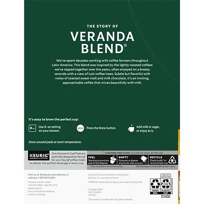 Provide your staff break room with this regular Keurig K-Cup Starbucks Veranda Blend coffee. The light roast profile of this blended brew is flavorful and mellow with delicate nuances, so it’s just right for a caffeinated boost, and the quick brewing method saves time. This Kosher-certified Keurig K-Cup Starbucks Veranda coffee comes in a pack of 24 for a plentiful supply.