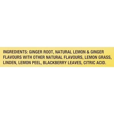 Ginger Root, Natural Lemon & Ginger Flavors with Other Natural Flavors, Lemon Grass, Linden, Lemon Peel, Blackberry Leaves, Citric Acid