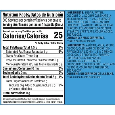 Ingredients: sugar, water, coconut oil, sodium caseinate (a milk derivative), and less than 2% of propylene glycol, dipotassium phosphate, natural and artificial flavor, polysorbate 60, sodium stearoyl lactylate, color added, sucralose (non-nutritive sweetener)