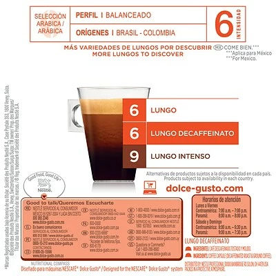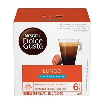 Nescafe Dolce Gusto Lungo Decaf is a full-flavored, naturally decaffeinated coffee with roasted coffee notes and undertones of ripe blackberry. It is full bodied with a fine silky crema. Intensity: 6 out of 11. WHAT’S INSIDE – A unique blend of coffee beans, naturally decaffeinated using pure water without compromising the rich flavors and aromas. This gourmet Lungo is full bodied with a fine silk crema. COFFEEHOUSE-QUALITY DRINKS – Create professional quality specialty beverages, coffees and espresso with a rich velvety crema thanks to the machine’s high pressure. EASY TO PREPARE – Simply pop in the capsule and brew. AROMA FRESHNESS – Hermetically sealed capsules, for a rich and aromatic cup every time.