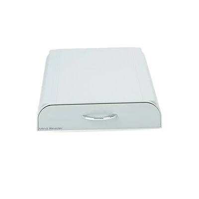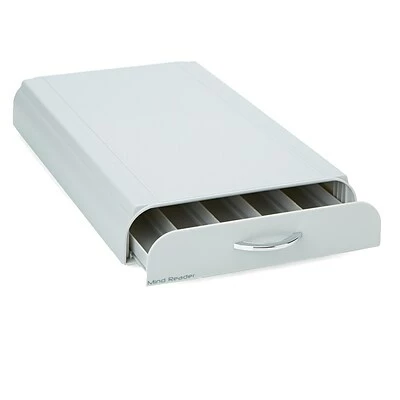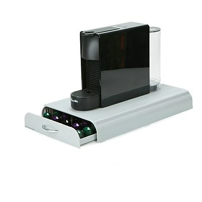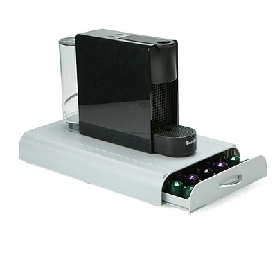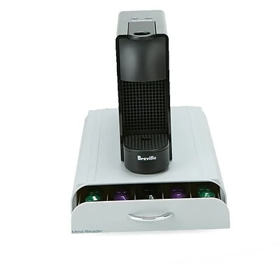 Mind Reader Anchor coffee pod storage drawer in silver/gray color has plastic construction with chrome handles for stylish look. Drawer measuring 2 1/4″ x 9 1/4″ x 15 1/4″ can hold single-serve coffee machine on top and is ideal for home/office use.