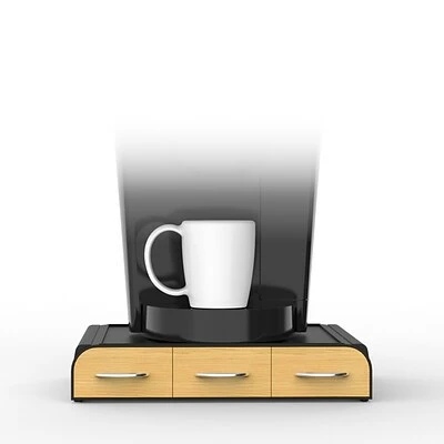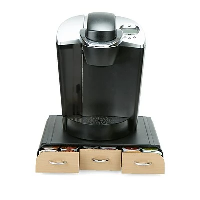 Mind Reader Anchor coffee pod storage drawer in black color has ABS plastic/wood construction with chrome handles for stylish look. Drawer measuring 2.72″ x 13.46″ x 12.87″ features 3 organized drawers with each holding 12 pods.