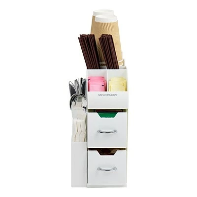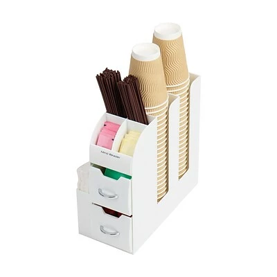 There’s a lot that goes into prepping the perfect cup of coffee or tea. The coffee cup, lid, sweetener, creamer, stir stick, spoon and napkin are all important accessories. This super handy unit includes separate compartments and drawers to keep them all organized. No more rifling through cabinets or messy condiment drawers – simply open and go.