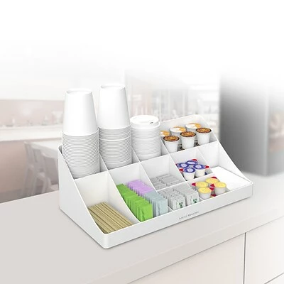 One piece White coffee condiment organizer is made from a tough and safe plastic that will stand the test of time. This unit has 11 compartments that is a necessity for any Break room or Lunchroom.