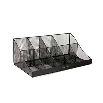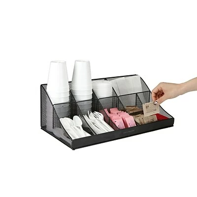 One piece Black metal mesh coffee condiment organizer is made from a tough and safe plastic that will stand the test of time. This unit has 11 compartments that is a necessity for any Breakroom or Lunchroom.