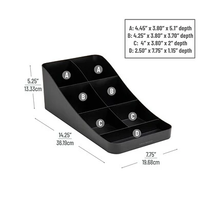 The right size: Measuring 14.25 long x 7.75 wide x 5.25 inches tall (36.19 x 19.55 x 13.33 centimeters), this 7-compartment condiment organizer slides smoothly into the smallest spaces to tidy coffee condiments