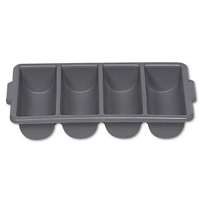Plastic Polypropylene Cutlery Bin with 4 Compartments is made of long-lasting commercial grade gray plastic. The piece features 4 compartments and a ribbed design.