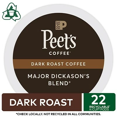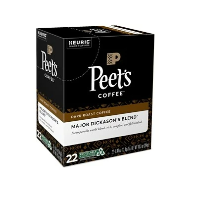 Begin the work day with a steaming cup of coffee from these coffee pods. The dark roast provides a rich, complex taste and a smooth finish, while the pod design makes it simple to brew one serving at a time. These Keurig K-Cup Peet’s Coffee Major Dickason’s Blend regular coffee pods come with 22 in each pack, so it’s easy to fill up the break room stock. A loyal customer of our original Berkeley store, retired army officer Key Dickason brought the idea for our most beloved blend to Mr. Peet in 1969. Intrigued, our founder worked with the local gourmand and coffee aficionado to refine it. They sampled countless combinations before arriving at what is now our all-time bestseller. The result was so good, Alfred Peet decided naming it after his friend wasn’t enough โ Dickason’s rich, complex blend also deserved a promotion from sergeant to major. Peet’s Coffee Major Dickason’s combines the best origin coffees from the world’s premier growing regions, each imparting its distinctive regional characteristics while still effortlessly rounding into a smooth, balanced cup. Over the years, Major Dickason’s has become the coffee that epitomizes Peet’s: flavorful, deeply roasted, and unsurpassingly satisfying. But for us, Major D’s is just like a relationship with an old friend. We’ll always remember it as the story of a customer’s passion, an expert’s palate, and a shared love of coffee. Compatible with Keurig K-Cup Pod Single Serve Coffee Makers.