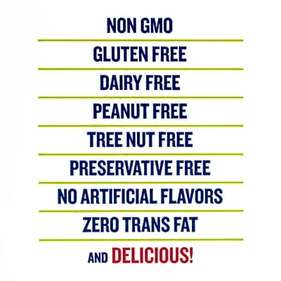 Non-GMO, Diary free ,Gluten free, Peanut and tree nut free, No artificial ingredients flavors or preservatives No trans fat