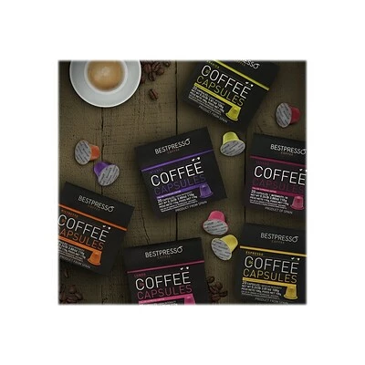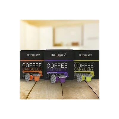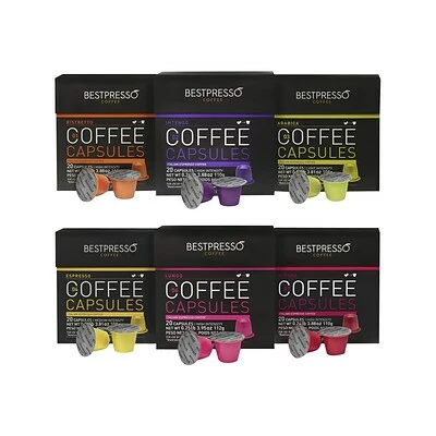 Savor the smooth body and rich, distinct taste of these pods. Compatible with most OriginalLine Nespresso machines, these coffee capsules are easy to use and ideal for preparing a quick cup. These Bestpresso pods include six different flavors and come with 120 to a box so that you can easily stock up office break rooms or shared kitchens easily.