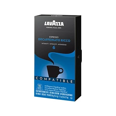 The full-bodied Brazilian arabica and sweet Southeast Asian robusta yield a velvety blend with a sweet and rich taste, thanks to a natural decaffeination method that preserves the beans’ aroma. The Lavazza Decaffeinato Ricco coffee capsule is compatible with Nespresso Original machines.