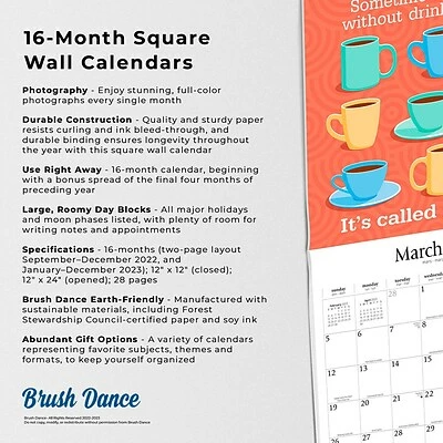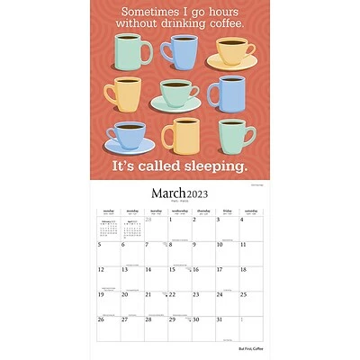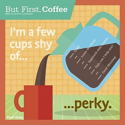 You know it, you love it, you can’t start your day without itโanything and everything you do all day comes after your morning coffee. Each month includes a fun graphic depicting the sacred drink, as well as a witty comment to bring a smile to your face … after your first cup of coffee, that is. Classic square format. Updated style. Our wall calendars include stunning images and even clearer grids and text. Filled with an abundance of holidays, each monthโs grid is large enough for daily tasks and appointments.