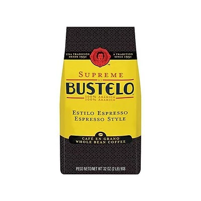 Increase productivity around the office with this espresso-style coffee. Made from 100 percent Arabica beans, this coffee boasts a smooth body and rich texture. This Cafe Bustelo Supreme whole-bean coffee produces a bold, delicious aroma and comes in a 32-ounce bag, making it easy to restock the supply closet or share with customers, employees and other guests.